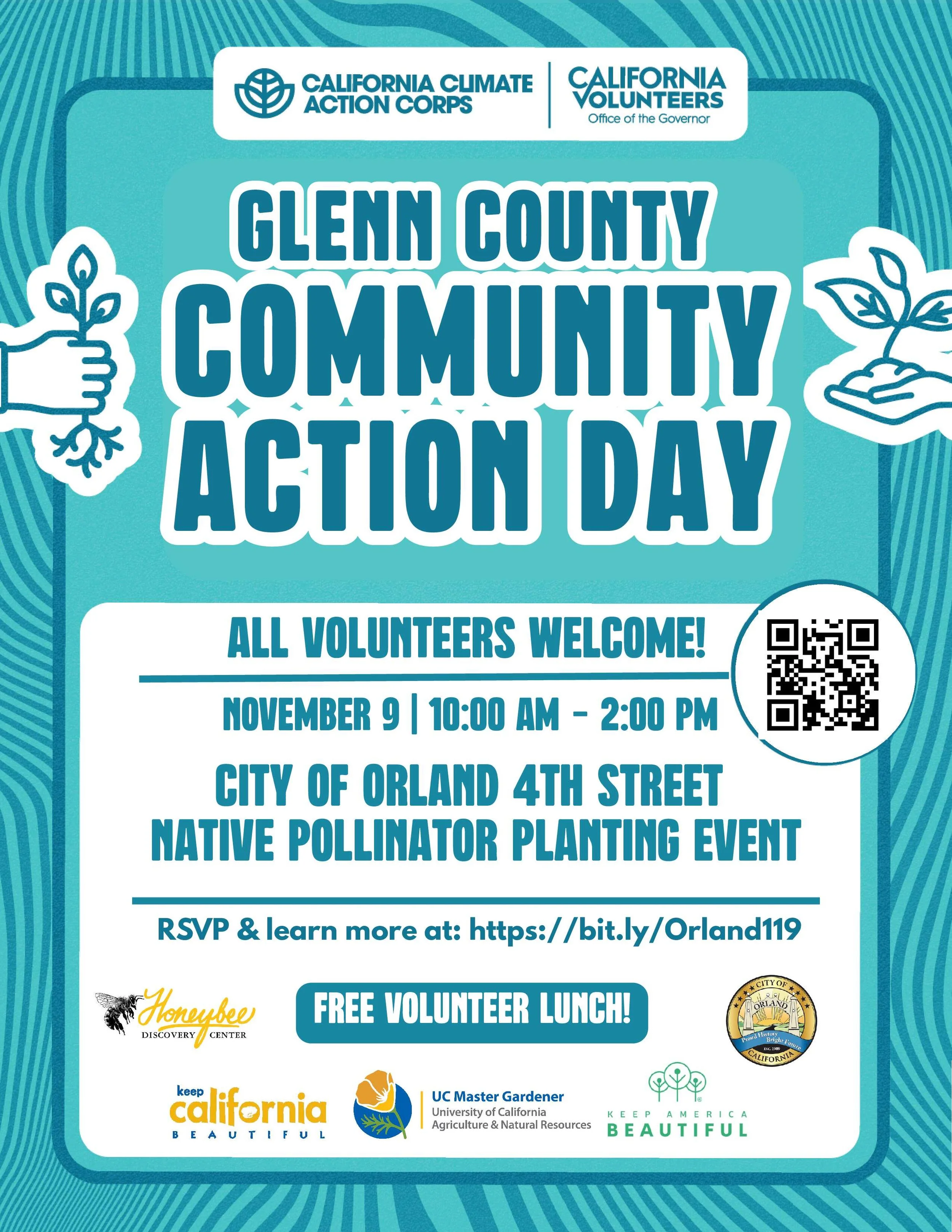 The service project offers an opportunity for community volunteers to contribute to the effort to increase the number of native pollinator plants in green spaces within the City of Orland, which are crucial to a healthy ecosystem. This opportunity is made possible through partnerships at the state and local levels, including the City of Orland, Honeybee Discovery Center, Glenn County Master Gardeners, Keep California Beautiful, Keep America Beautiful, and the California Climate Action Corps, a program of California Volunteers, Office of the Governor. Volunteers are welcome to arrive between 9:30 am and Noon for check-in and are requested to volunteer for a minimum of 2 hours: