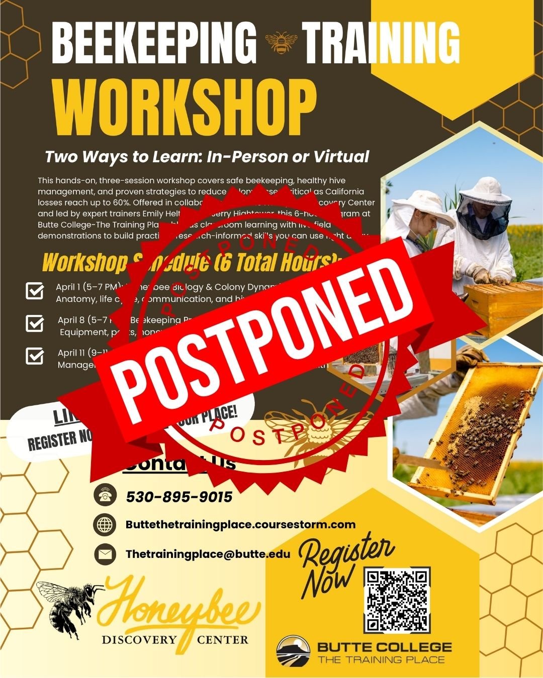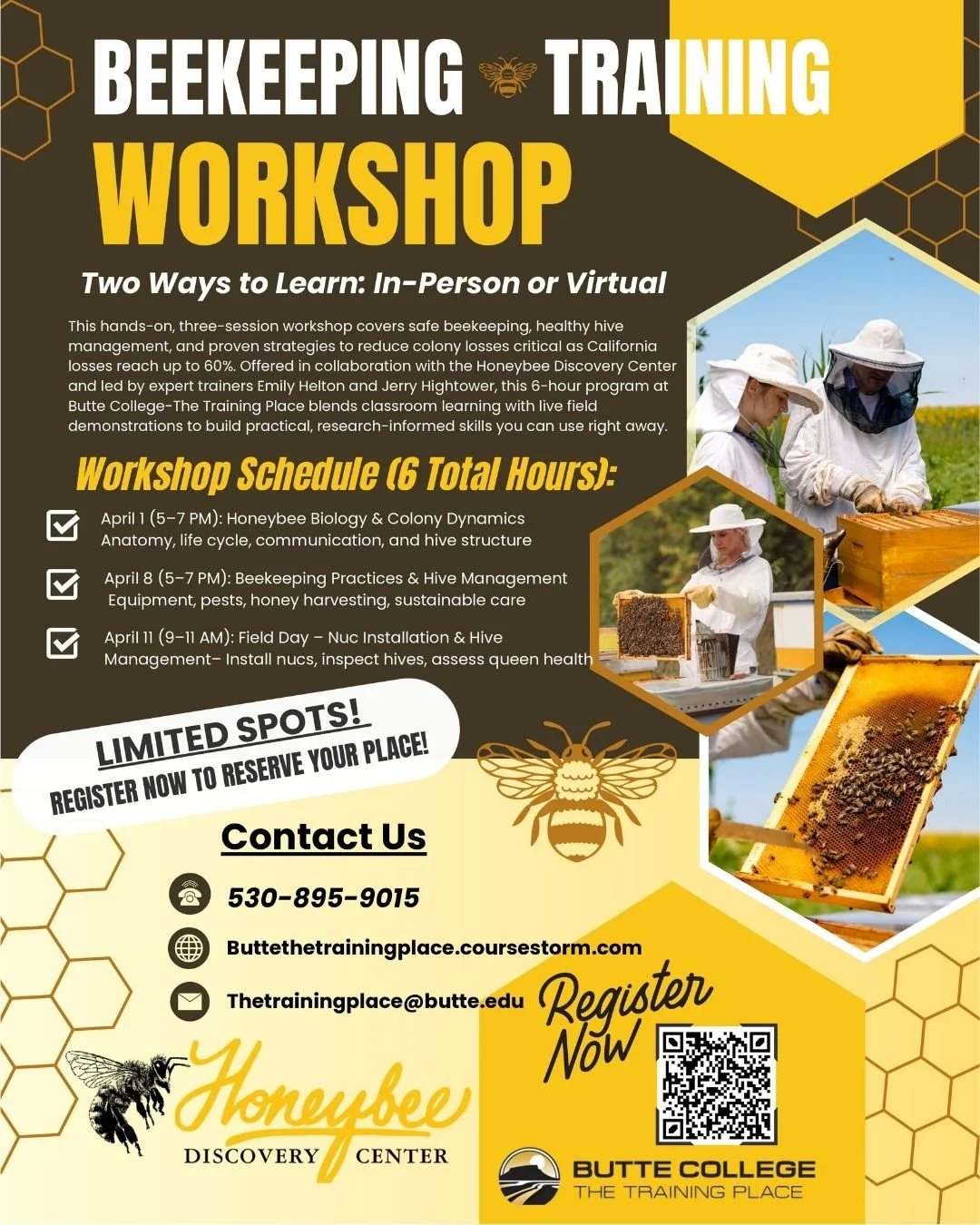 Hosted by Butte College The Training Place at the Glenn Center, this 6-hour program combines engaging classroom instruction with live field demonstrations to build foundational skills, strengthen hive health, and increase honey yield.